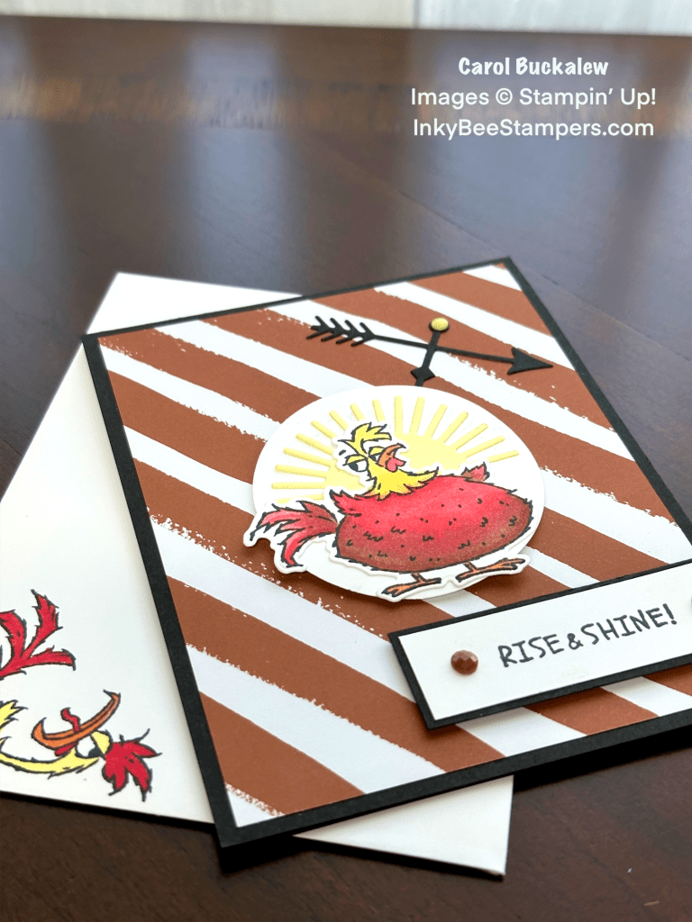 The same rooster stamped on the inside of the card was partially stamped onto the envelope front and colored in with Stampin’ Blends. I added a coordinating piece of designer series paper to the envelope flap and trimmed the excess paper away from the flap to finish off the envelope. I added several Adhesive-Backed Solid Gems to the card front to complete the card.