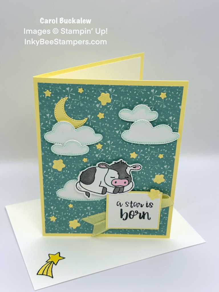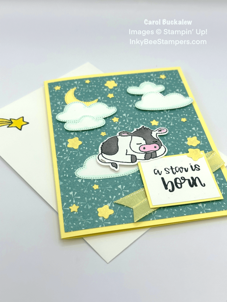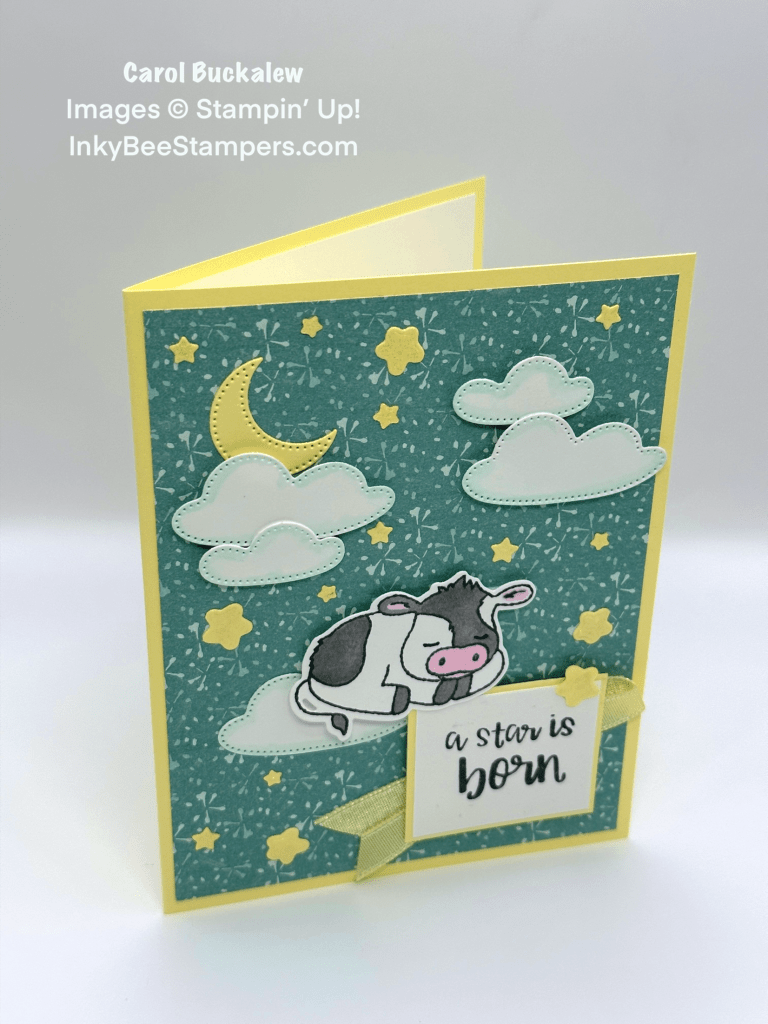 A length of Lemon Lolly Sheer Ribbon was folded in half and adhered with a small amount of Stampin’ Seal on the lower right corner of the card front. The sentiment label was placed over top of the folded ribbon using Stampin’ Dimensionals. I tucked one of the clouds just under the upper left corner of the sentiment label and adhered it to the card front using liquid glue. The cow was colored in using Smoky Slate and Bubble Bath Stampin’ Blends, then adhered just above the cloud and sentiment label using Stampin’ Dimensionals. Next, the remaining clouds were adhered to the card front using Stampin’ Dimensionals and the moon and stars were adhered using liquid glue.