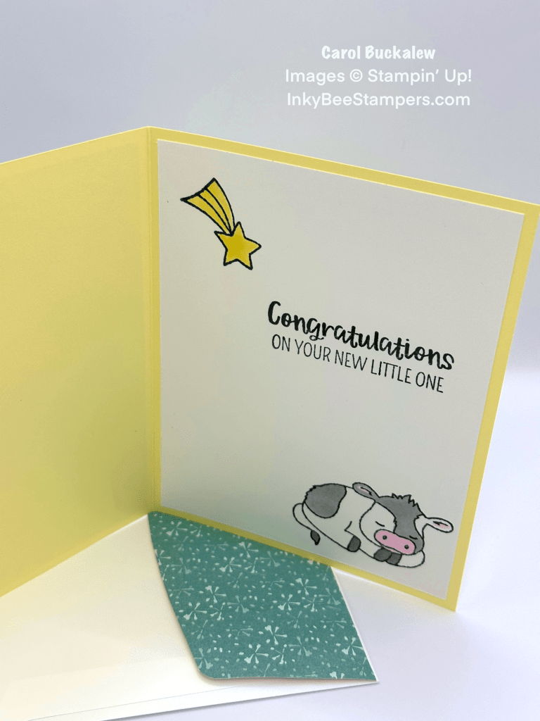 For the inside panel, I stamped the image of the shooting star onto the upper left corner and colored the image with a Lemon Lolly Stampin’ Blend. An additional sentiment was stamped onto the panel and the image of the cow was stamped onto the lower right corner. I used the same Stampin’ Blends to color in the cow as I did for the front of the card. The panel was then adhered to the inside of the card.