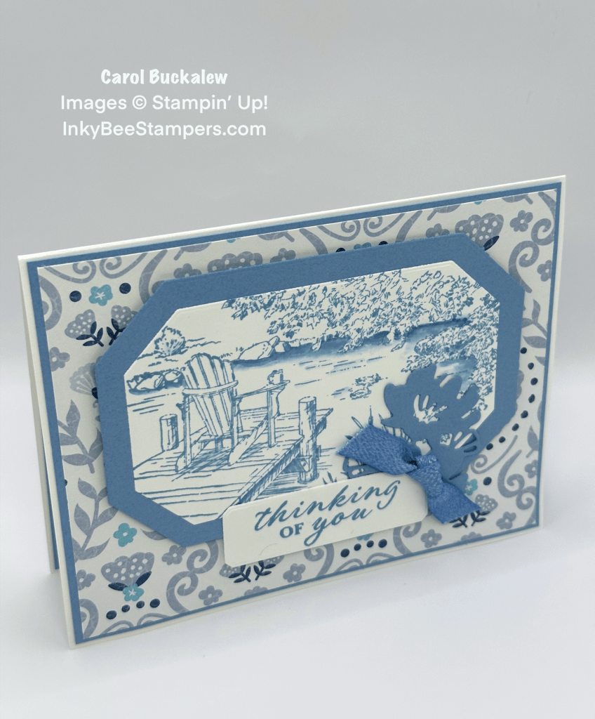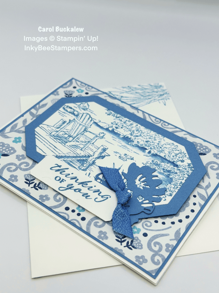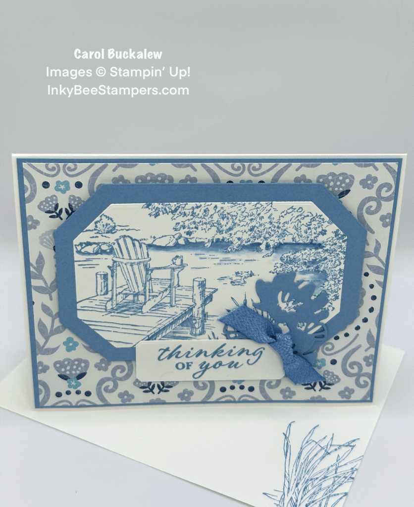 This pretty pond scene from the Calm & Quiet Stamp Set reminds me of Delft Pottery from the Netherlands and Boho Blue ink was the perfect color choice! In addition to using the Calm & Quiet Stamp Set I also used the Countryside Inn 12″ x 12″ Designer Series Paper and the Countryside Corners Dies. The sentiments and flower die cut were pulled from the Wonderful Thoughts Bundle.