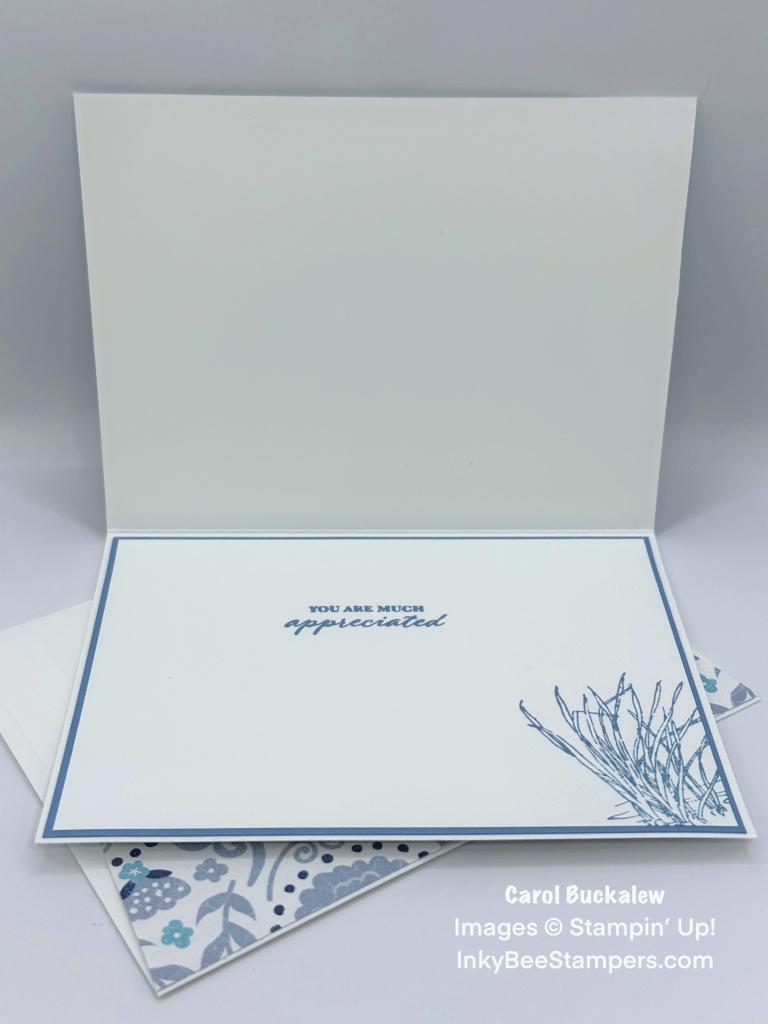 I stamped an additional sentiment onto the inside panel in Boho Blue ink from the Wonderful Thoughts Stamp Set. The small grass image from the Calm & Quiet Stamp Set was partially stamped onto the lower right corner of the panel in Boho Blue ink. I did not stamp the birds included on this stamp. The inside panel was adhered to a Boho Blue mat then adhered to the inside of the card.
