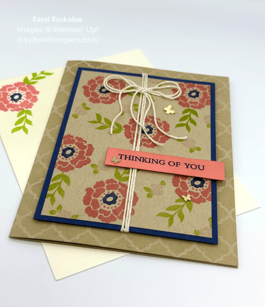 The stamped panel was then adhered to a mat in Night of Navy. I used a cream color Baker’s Twine and wrapped the twine around the stamped and matted panel three times. The ends of the twine were secured to the back of the panel using small amounts of Stampin’ Seal. I then adhered the panel to the card front using Stampin’ Dimensionals. I added a double Baker’s Twine bow towards the top of the card. The sentiment was stamped onto a Flirty Flamingo sentiment label, and I adhered the sentiment label approximately two thirds of the way down the card front and to the right. The sentiment label slightly overhangs the wrapped twine on the left.
