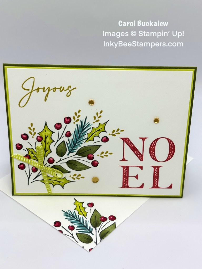 I repeated partial stamping of the berry and holly image onto the envelope front using Tuxedo Black Memento ink and colored in the image. For the envelope flap, I used the two small holly leaves from the Joy of Noel Stamp Set and adhered both to a stamping block then stamped the leaves onto the envelope flap. The small cluster of berries were stamped in Cherry Cobbler ink in between the two small leaves. The holly leaves were colored in using a Lemon Lime Twist Stampin’ Blend. Lemon Lime Twist Ribbon was used to tie a small bow which was adhered to the card front using a Mini Glue Dot. Several gold Pastel Adhesive-Backed Sequins were also added to the card front.