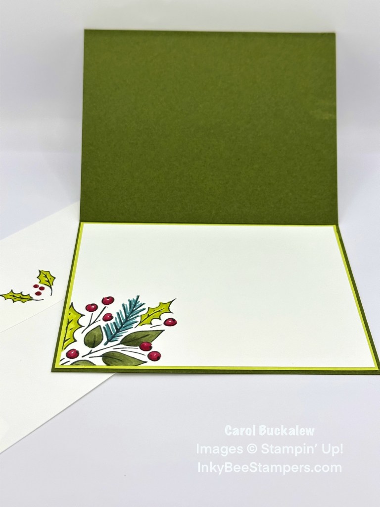 To keep things simple, I partially stamped the same berry and holly image onto the inside panel and colored the image in using the same Stampin’ Blends as I did for the front of the card. The panel was adhered to another Lemon Lime Twist mat, then adhered to the inside of the card.