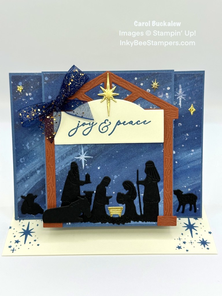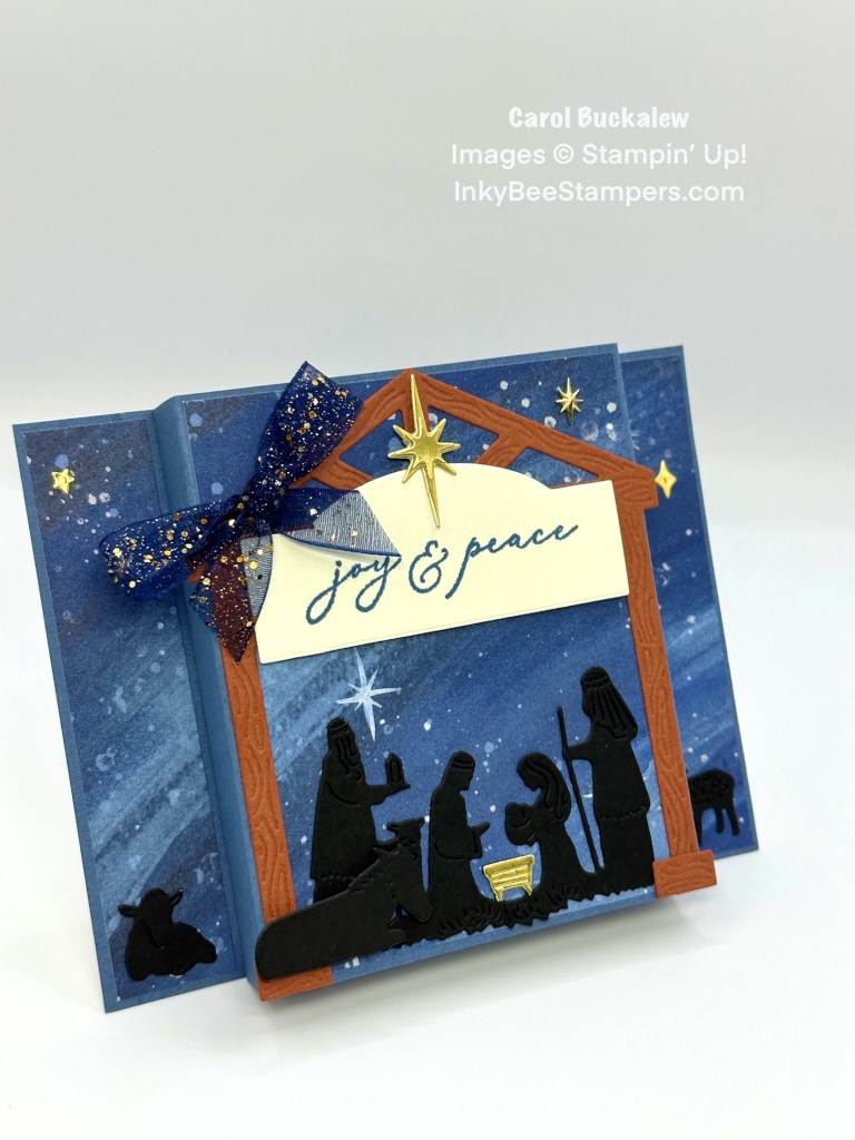 The sentiment label was cut from the Stars at Night Dies set and the “Joy & Peace” sentiment from the Night Divine Stamp Set was stamped in Misty Moonlight ink on to the label. The sentiment label was adhered to the top of the center panel using Stampin’ Dimensionals. Several stars were die cut from the Stars at Night Dies set in Gold Foil and the largest of these was adhered to the top of the manger. The smaller stars were adhered to the left and right panels. I also added several of the Adhesive-Backed Star Trinkets to the card front. A Night of Navy & Gold Glittered Ribbon bow was added to the top lef top of the sentiment.
