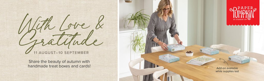 The With Love & Gratitude Paper Pumpkin Kit offers the perfect way to give thanks to the special people in your life. The kit design is an elegant representation of the blessings of autumn and the gratitude that comes along with the season. The combination of graceful pumpkin designs and elegant colors, plus specialty gold foil embellishments make this kit a stand-out offering ! Be sure to subscribe by 10 September to get your kit full of iconic autumn images, love, and gratitude!