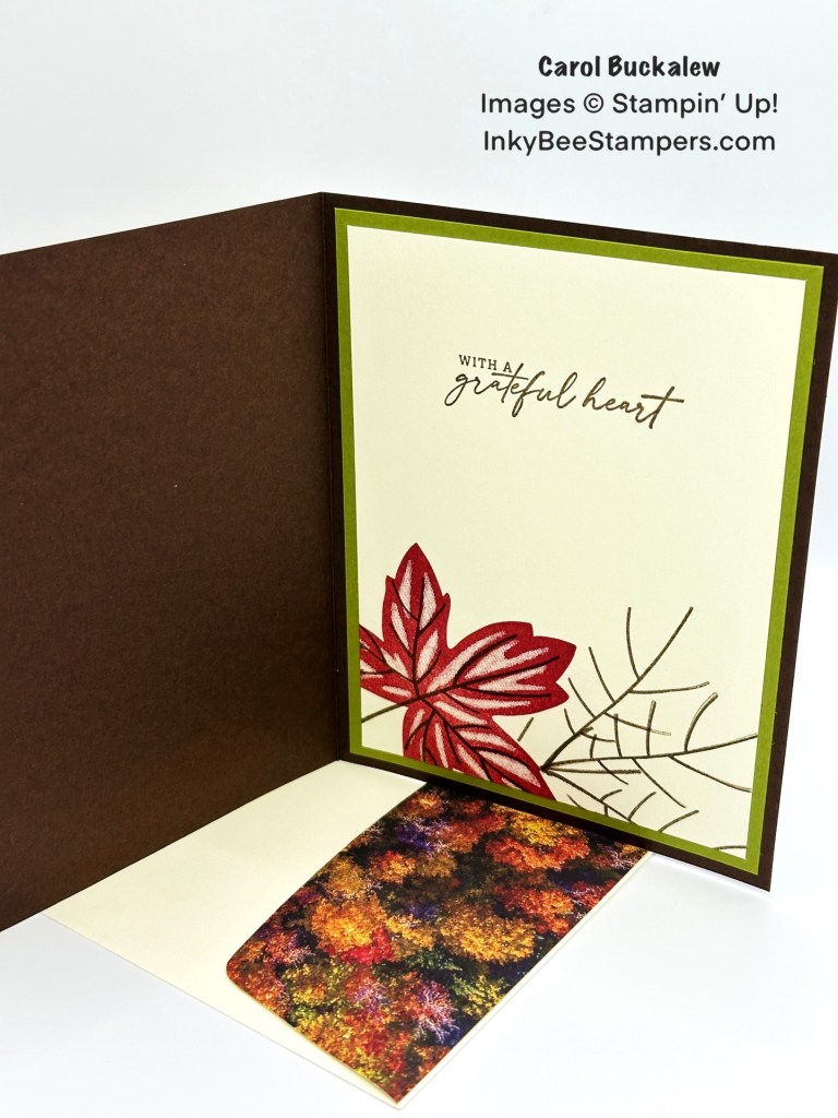 An additional sentiment was stamped onto the inside panel and the maple leaf was stamped onto the lower left corner of the panel, along with a few twigs. The panel was adhered to a mat in Old Olive, then adhered to the inside of the card.