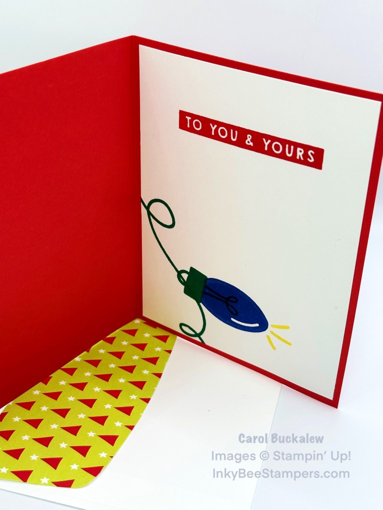On the inside panel I stamped an additional sentiment in Poppy Parade ink then stamped a bulb and its electric cord onto the lower left of the panel. The panel was then adhered to the inside of the card.