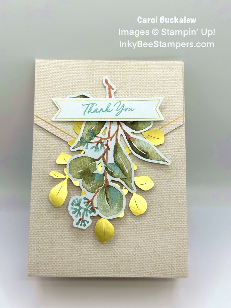 Here is one of the eight cards that I completed. The cards measure 3-1/2″ x 3-1/2″ and are the perfect “thank you” card to give to a friend or family member. Check out the pretty gold foil on the card!