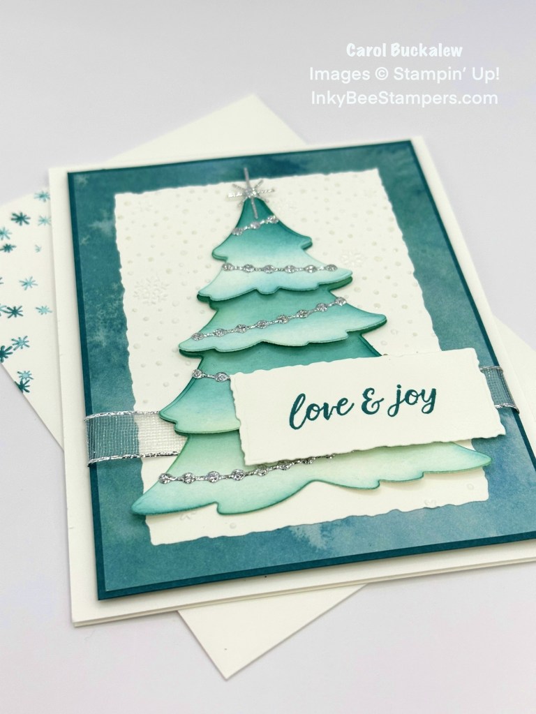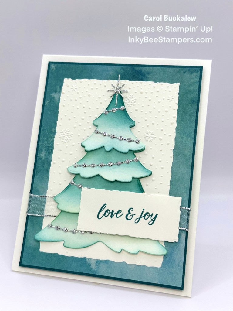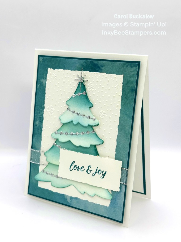 I’m back with a lovely card created with the Merriest Trees Bundle – one of my all-time favorite Christmas sets! I also used the Snowflake Sky 3D Embossing Folder, Winter Meadow 12″ x 12″ Designer Series Paper and Silver 12″ x 12″ Adhesive-Backed Glimmer Paper. Oh, and I did a little ink blending to really highlight the die cut tree!