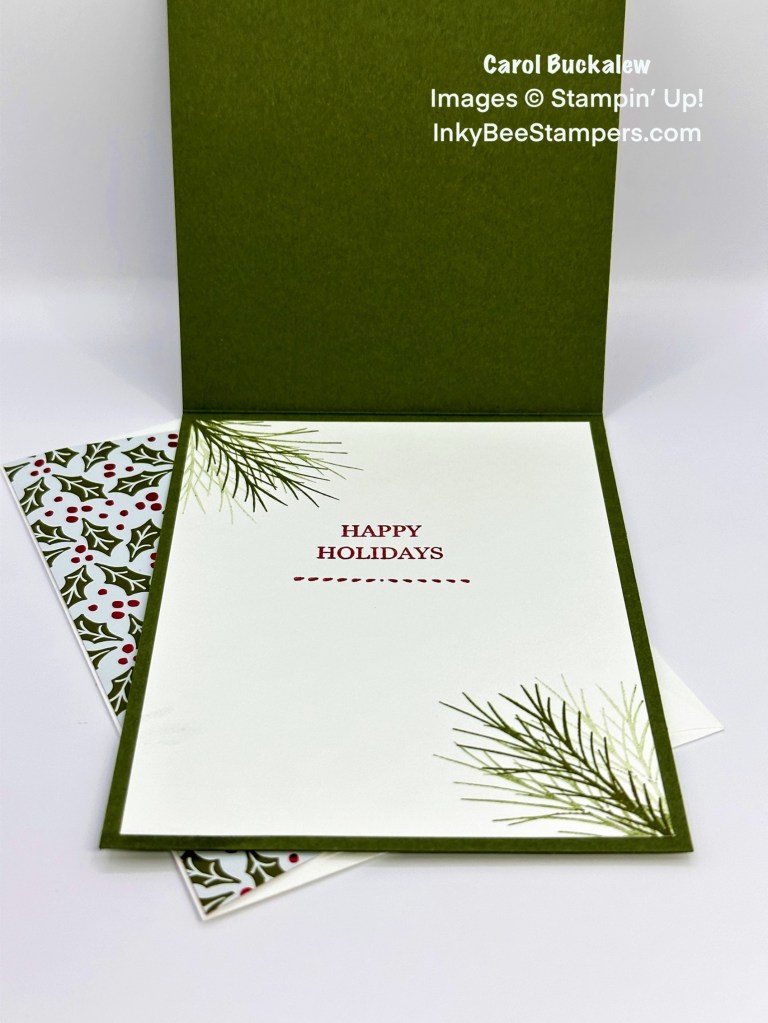 An additional sentiment from the Christmas Classics Stamp Set was stamped on the inside panel in Cherry Cobbler ink and the decorative dashed line image was stamped just below the sentiment. The pine bough image was first and second-generation stamped onto the upper left and lower right corners of the panel in Mossy Meadow ink. [The pine bough image from the Christmas Classics Stamp Set stamps beautifully BTW!] The panel was then adhered to the inside of the card base.