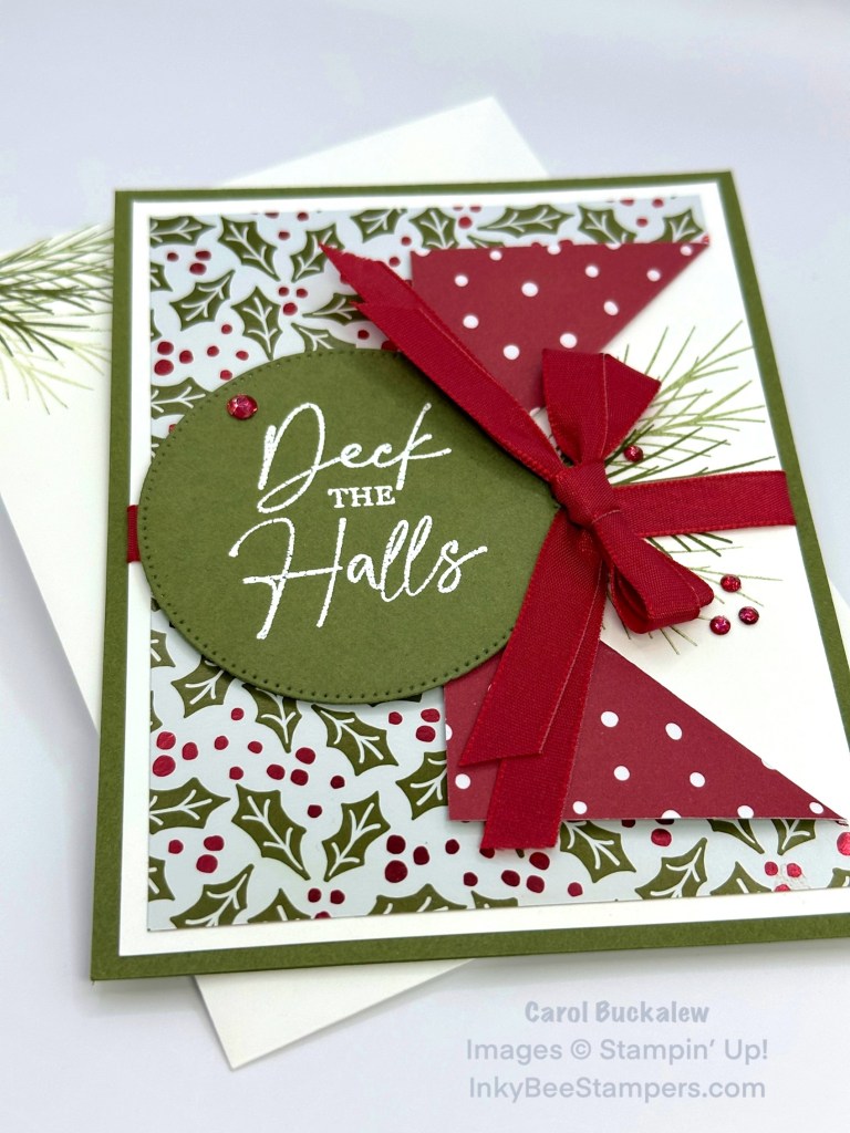 The second to largest circle die was used to cut out a Mossy Meadow sentiment label. The “Deck the Halls” sentiment was stamped onto the label using VersaMark ink and I sprinkled white embossing powder over the area then used a Heat Tool to set the embossing powder. The sentiment label was adhered to the card front using Stampin’ Dimensionals and was positioned on the left side of the card and over top of the wrapped ribbon. Using two lengths of Real Red Ribbon I tied a bow and adhered the bow to the right center of the sentiment label using Mini Glue Dots.