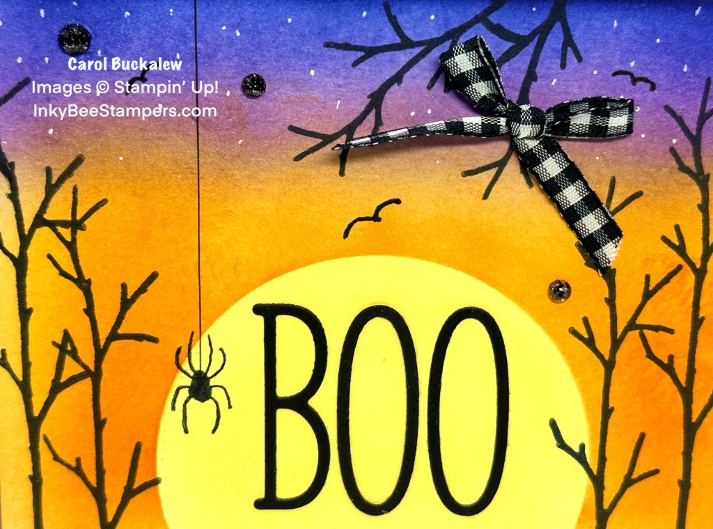 I used the Alphabet A La Mode Dies to cut out the letters to spell “BOO” from Basic Black cardstock. The letters were glued directly over the moon. From the Cottage Wreaths Stamp Set I stamped the spider to the left of the word “Boo”. Spiders have webs, so I used a Basic Black Stampin’ Write marker to draw a web from the top of the panel to the spider. Spiders are icky and SPOOKY!