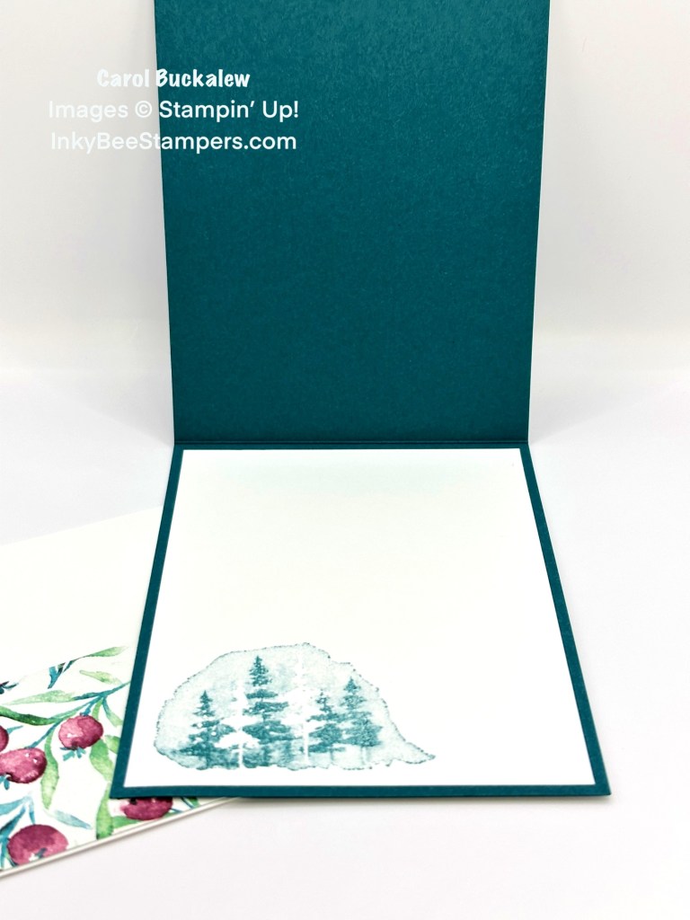 The distressed pine tree image from the Magical Meadow Stamp Set was second-generation stamped onto the inside panel in Pretty Peacock ink. The panel was then adhered to the inside of the card.