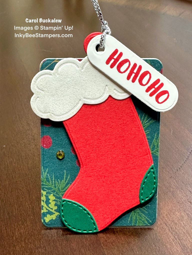 This sweet little Christmas Stocking was die cut from Poppy Parade cardstock with the toe and heel cut from Shaded Spruce. The stocking top was die cut from white cardstock and brushed with Wink of Stella. The small oval sentiment label was die cut using the Sending Cheer Dies. The stocking sits on a tag die cut from a pine and berry print from the A Walk in the Forest Designer Series Paper.