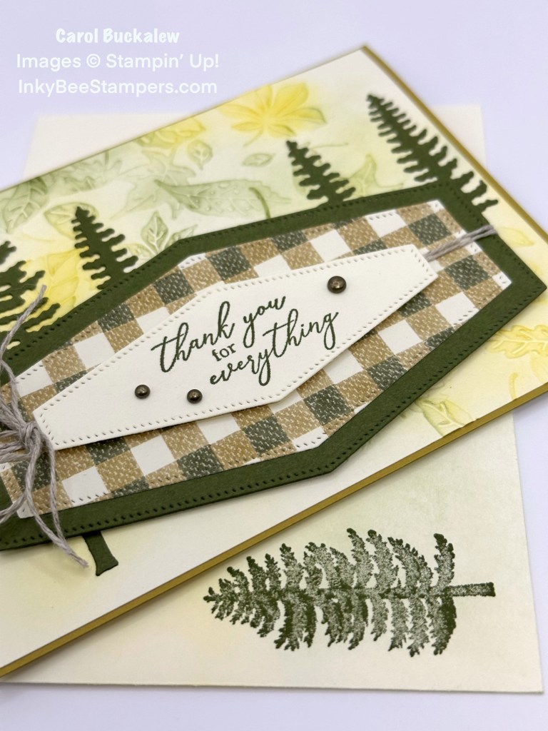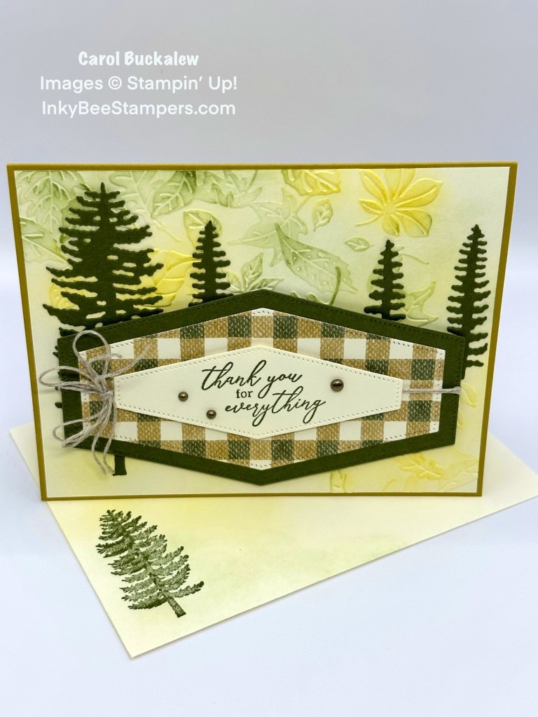 The Forever Forest Bundle was used to create today’s card in addition to some paper from the Let’s Go Fishing 12″ x 12″ Designer Series Paper pack, Nested Essentials Dies, Leaf Fall 3D Embossing Folder and a sentiment from the Botanical Layers Stamp Set. Wild Wheat, Mossy Meadow and Crushed Curry help to set the Fall mood of this card.