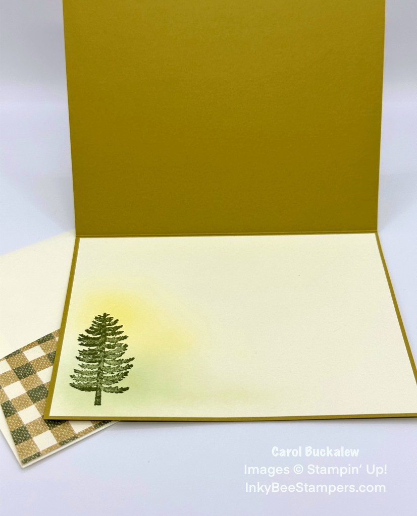 I kept the inside of the card simple and stamped a single pine tree onto the lower corner of the panel in Mossy Meadow ink. Without reinking my blending brushes, I brushed Mossy Meadow ink over the bottom portion of the pine tree and Crushed Curry ink over the top portion of the pine tree. The ink blending helps to ground the pine tree and provides a little background interest. The panel was then adhered to the inside of the card.