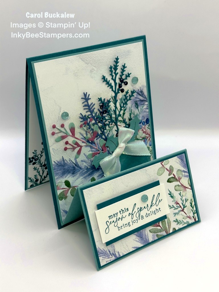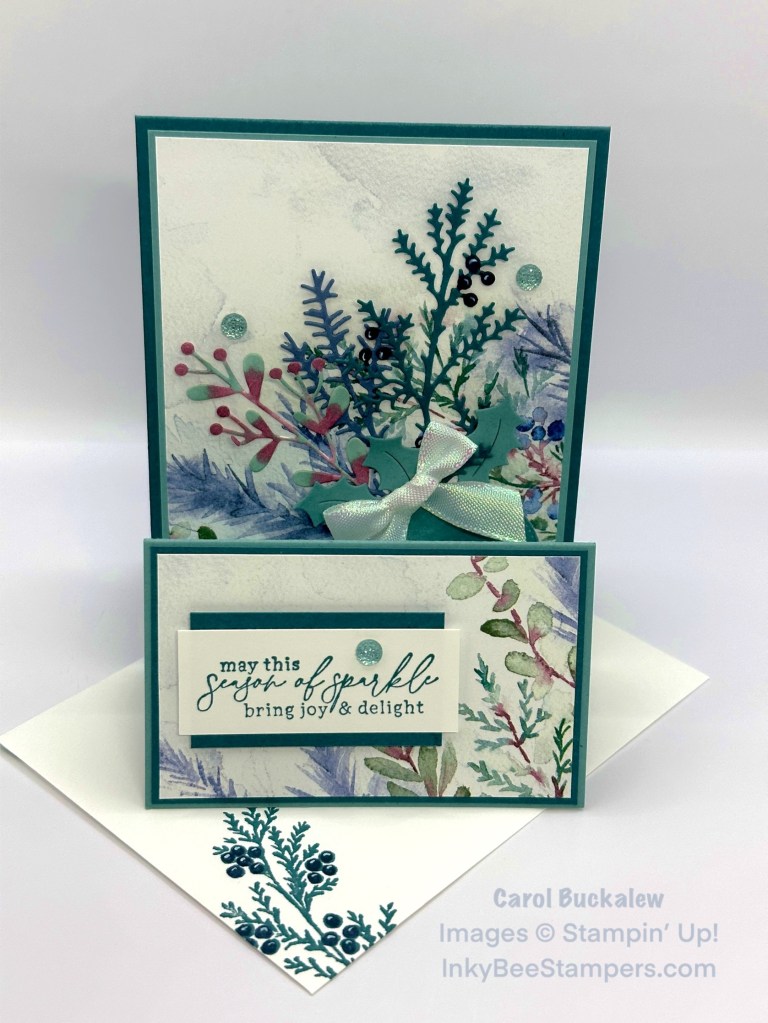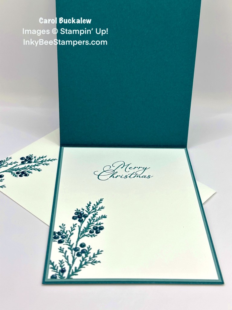 On the inside panel I stamped the “Merry Christmas” sentiment from the Stars at Night Stamp Set in Pretty Peacock ink. The pine sprig was partially stamped onto the lower corner of the panel in Pretty Peacock. I used a Misty Moonlight Stampin’ Blend to color in the berries and highlighted each berry using white pigment ink. The panel was adhered to a Lost Lagoon mat and adhered to the inside of Card Base #1.