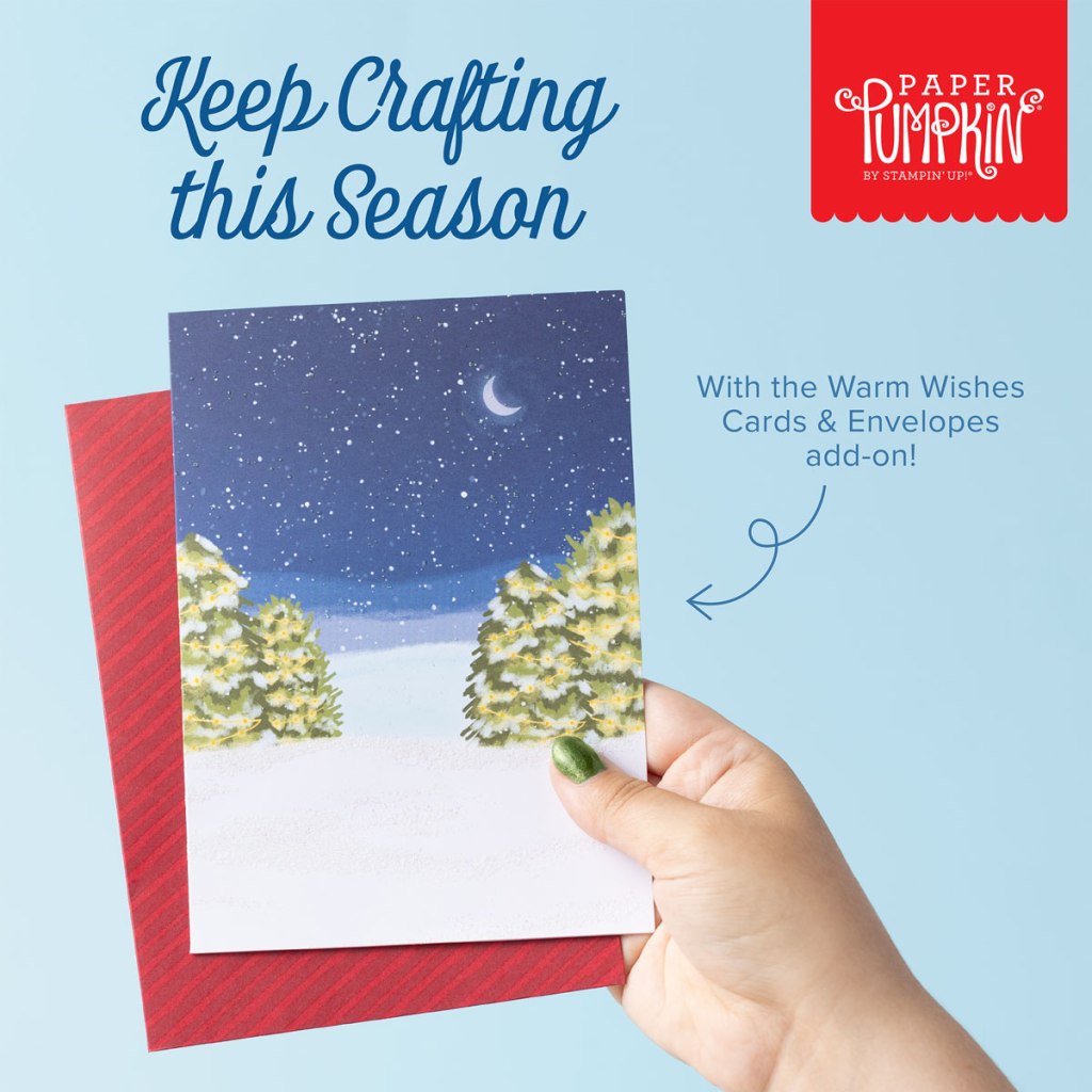 Light up the Christmas season with this month’s Paper Pumpkin kit! With traditional Christmas home designs and warm Christmas wishes, spread the light of Christmas with a gift box. Plus, you can get the Warm Wishes Cards & Envelopes Add-On to take your Christmas crafting even further (available while supplies last).