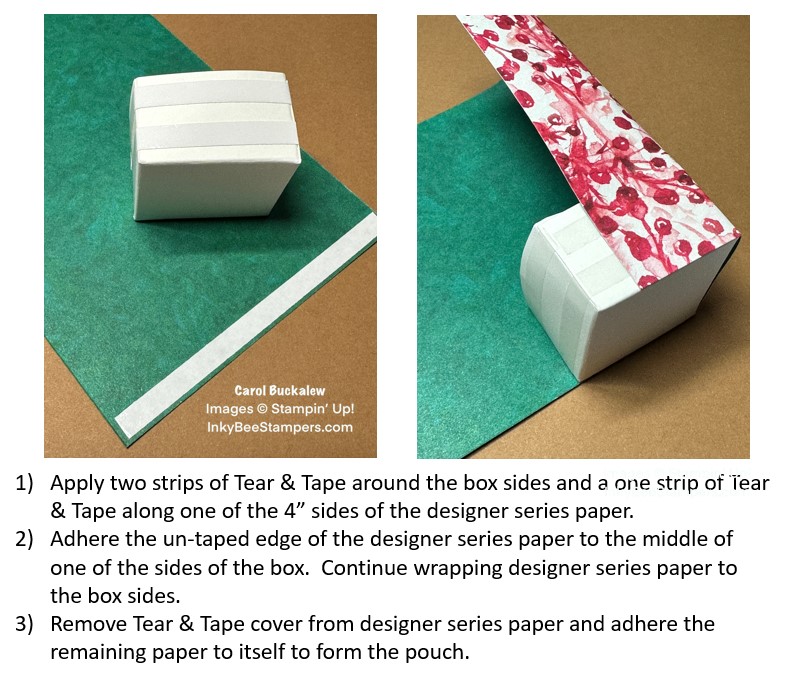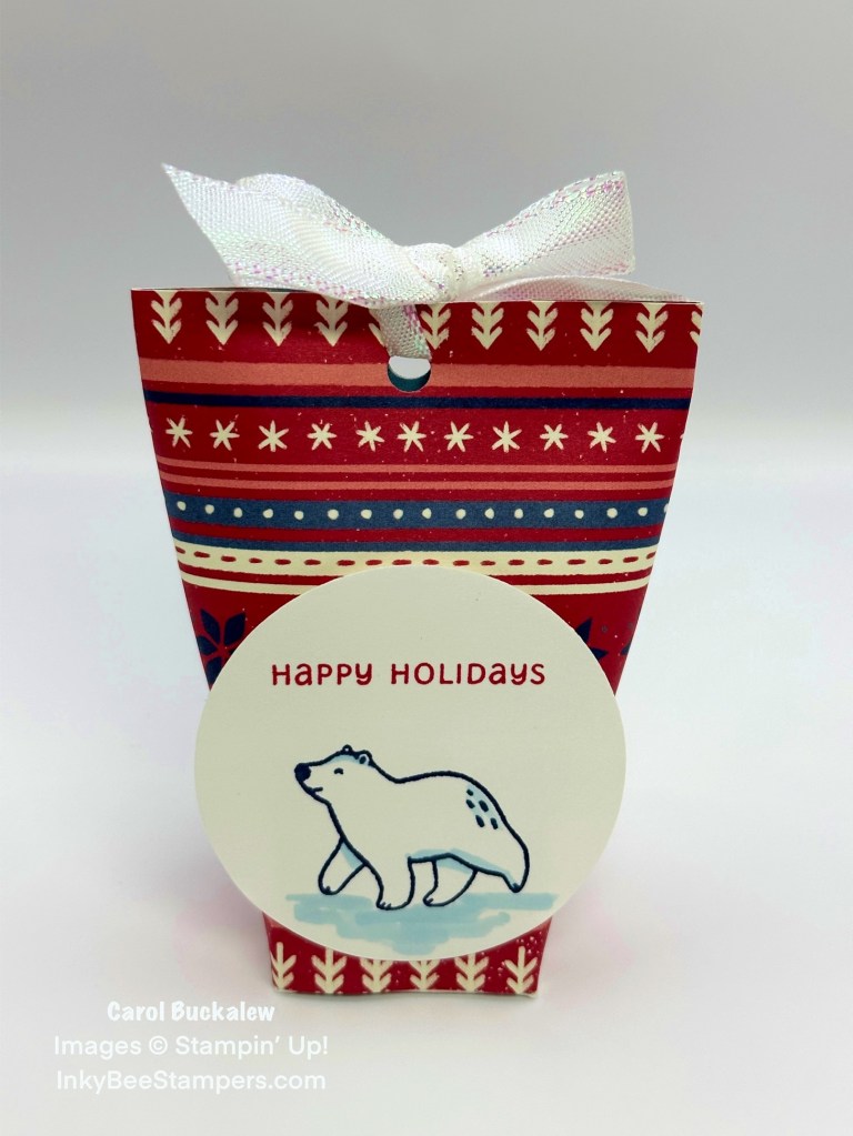 On the treat holder shown below, I used the Beary Christmas Designer Series Paper, the Beary Cute Stamp Set, White Iridescent Ribbon, and a 2-3/8″ Circle Punch.