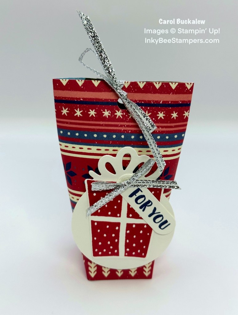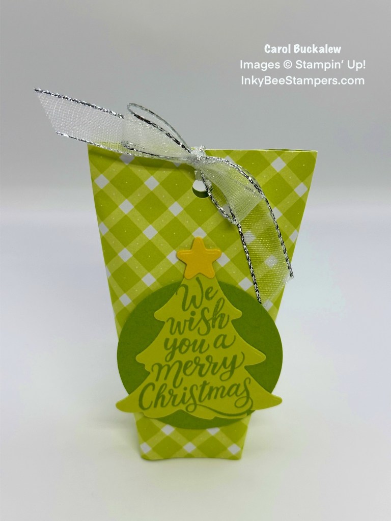 This treat pouch uses the Glorious Gingham 6″ x 6″ Designer Series Paper, the Merriest Trees Bundle, a 2″ Circle Punch, and Silver & White Sheer Ribbon. How fun!