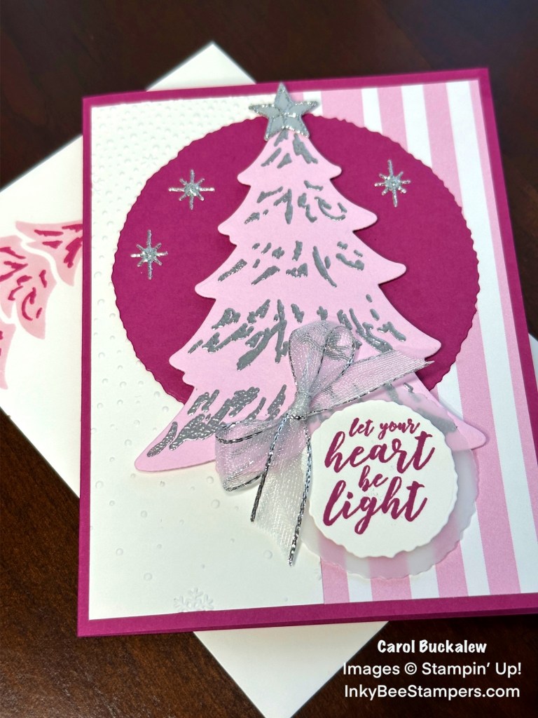 I’m dating myself with this card!  Anyone else remember pink Christmas tinsel trees?  We actually had a white tinsel tree in our house…one year it would be decorated with red lights, cardinals and red ornaments and the next year it would be decorated with blue lights, bluebirds and blue ornaments.  As a child I thought it was magical.  Times have really changed! I used the Merriest Trees Bundle and a few other products to create today’s “pretty in pink” Christmas card!
