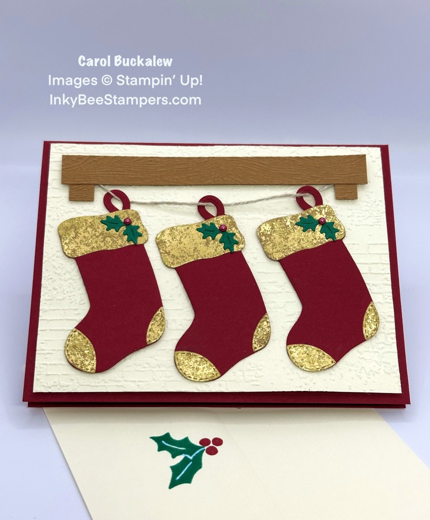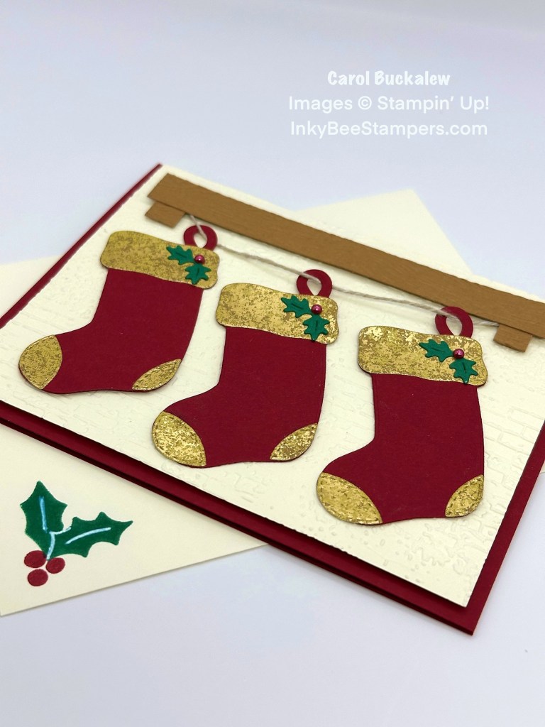 A Very Vanilla panel was embossed using the Exposed Brick 3D Embossing Folder. The panel was then adhered to the front of a Cherry Cobbler card base using Stampin’ Dimensionals. I then die cut three stockings from Cherry Cobbler cardstock, and all of the stocking pieces from Distressed Gold Specialty Paper. The small holly leaves on each stocking were die cut from Shaded Spruce using the Saint Nicholas Dies. The stockings were assembled using liquid glue and the holly leaves were added to the tops of the stockings.