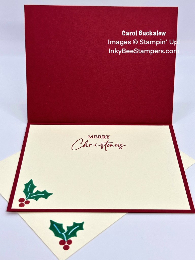 The “Merry” and “Christmas” sentiments from the Christmas Classics Stamp Set were stamped onto the inside panel in Cherry Cobbler ink. The holly image from the Sending Cheer Stamp Set and the berries from the same set, were stamped onto the lower corner of the panel in Shaded Spruce and Cherry Cobbler ink. The panel was then adhered to the inside of the card.