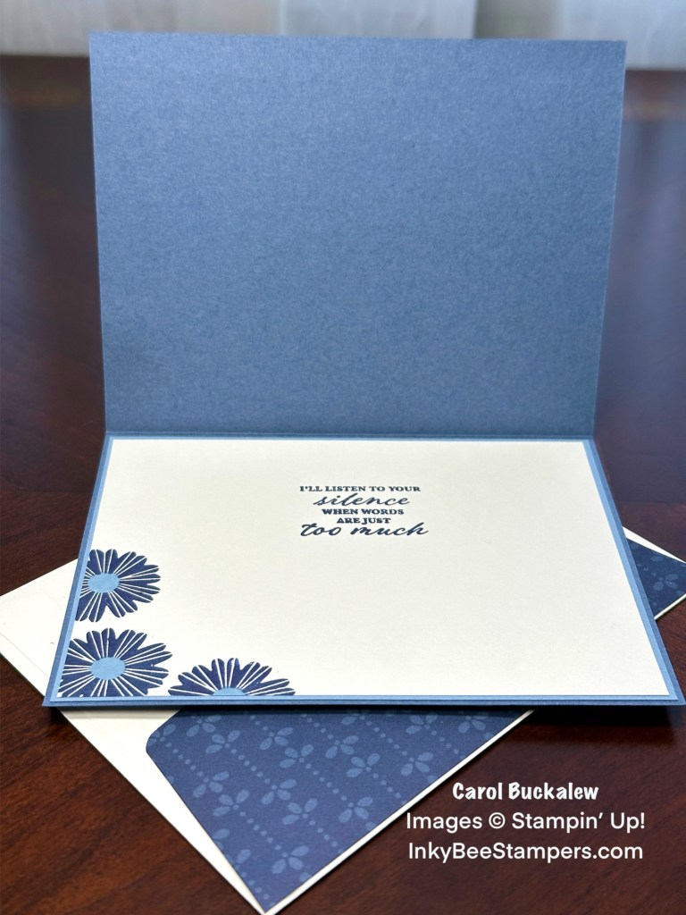 I stamped a second sentiment from the Wonderful Thoughts Stamp Set onto the inside panel in Night of Navy ink. A simple flower from the Modern Garden Stamp Set was stamped in Night of Navy ink several times onto the corner of the panel. The flower centers were stamped in Boho Blue ink. The panel was matted to a piece of Boho Blue, then adhered to the inside of the card.