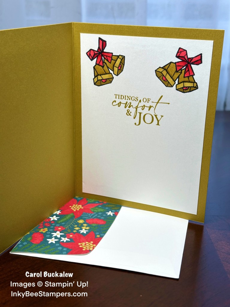 On the inside panel I stamped the bell image two times in the upper left and right corners in Tuxedo Black Memento Ink. The images were colored in with Poppy Parade and Wild Wheat Stampin’ Blends. I stamped an additional sentiment from the Christmas Classics Stamp Set onto the panel in Wild Wheat then adhered the panel to the inside of the card.