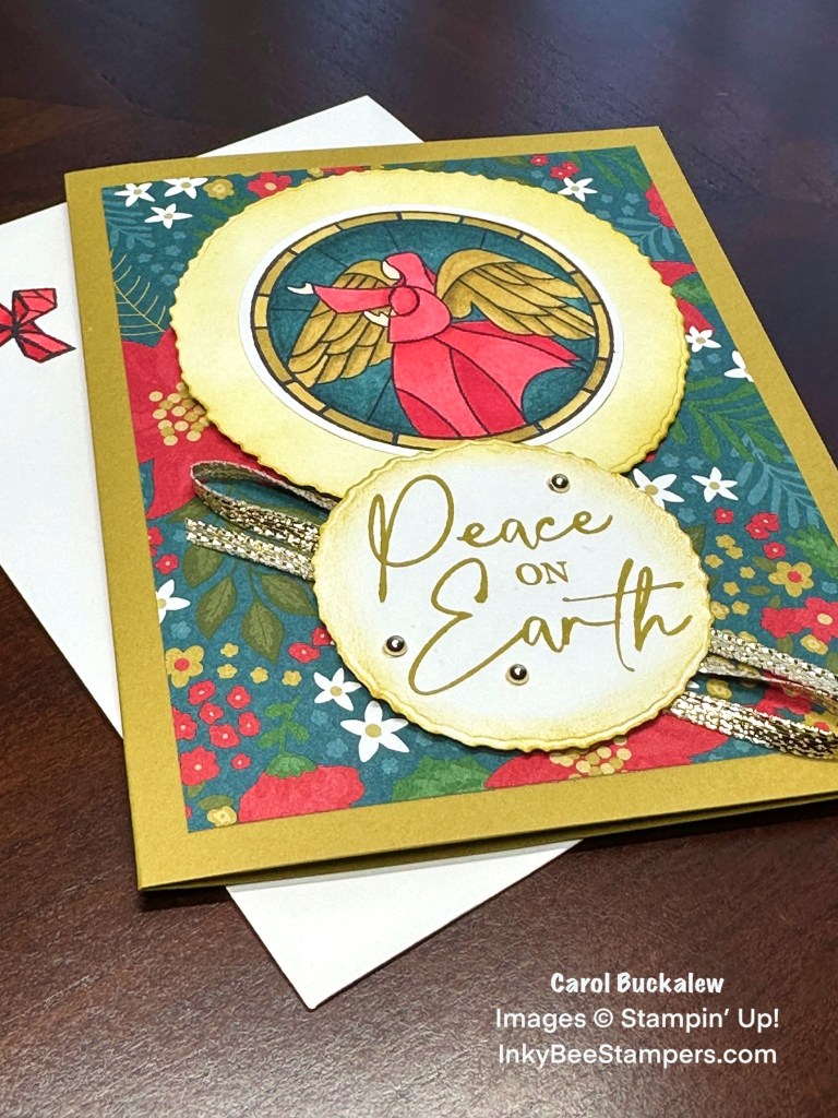 I used the Deckled Circles Dies to cut out a medium-sized circle and a small circle from Basic White cardstock. A blending brush was used to blend Wild Wheat ink around the edges of these circles to give them a glow. The stamped and colored angel circle was adhered to the larger of the two circles then adhered to the card front using Stampin’ Dimensionals. A sentiment from the Christmas Classics Stamp Set was stamped onto the smaller circle. Just below the large circle I used Stampin’ Seal to adhere several loops of Gold Trim and the sentiment label was also adhered to the card front using Stampin’ Dimensionals.