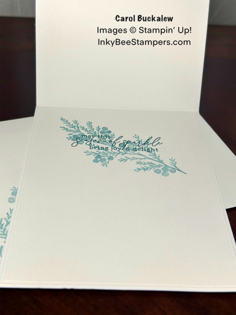 On the inside panels an additional sentiment was stamped in Pretty Peacock ink and the pine greenery image was third generation stamped over the sentiments. The panels were matted to white mats then adhered to the insides of the card bases.