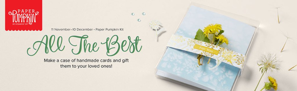 The All the Best Paper Pumpkin Kit comes with an acetate box that fits your finished cards and envelopes! This makes easy storage of a finished product or allows you to gift your cards to someone. The kit also comes with a belly-band, so you can add your own personal touch to the box. If you would like to order the All the Best Paper Pumpkin Kit you must subscribe to Paper Pumpkin no later than December 10, 2023.