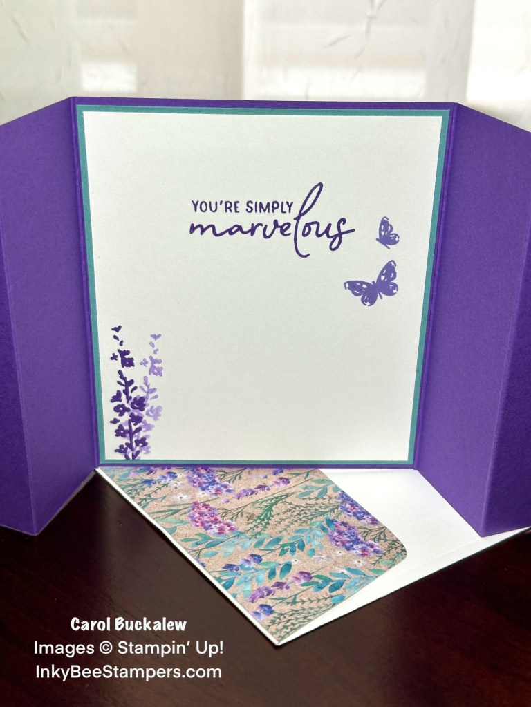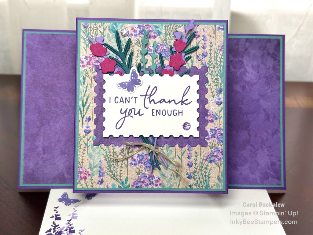 Onto a white panel I stamped an additional sentiment in Gorgeous Grape ink, then stamped one of the small lavender stems onto the lower left corner of the panel. Without reinking the stamp, I stamped the stem again next to the first stamped image. The butterfly image was stamped just below and to the right of the sentiment in Highland Heather ink. The panel was adhered to a Lost Lagoon mat, then adhered to the center panel on the back side of the card base.