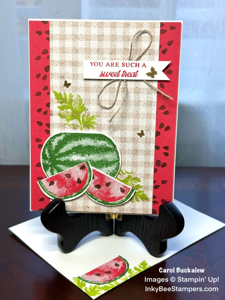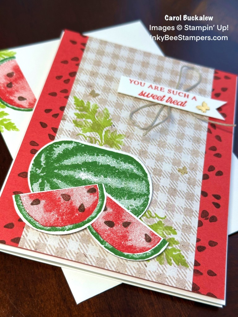 I started off with a mat in Sweet Sorbet and stamped watermelon seeds down the left and right sides of the mat to create a background. I added a piece of designer series paper in a neutral check print from the Perennial Lavender 12″ x 12″ Designer Series Paper (available on Jan 4 from the upcoming Jan-Apr 2024 Mini Catalog) and centered this panel from right to left.