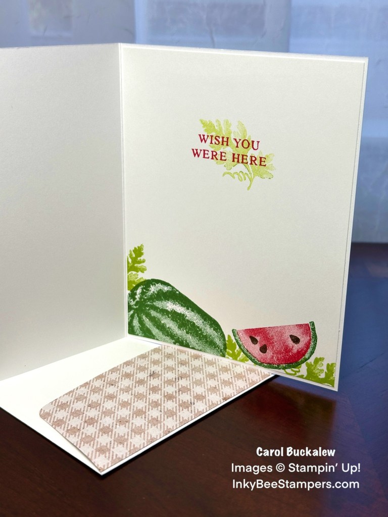 An additional sentiment was stamped onto the inside panel is Sweet Sorbet ink. The whole watermelon was stamped onto the lower left corner of the panel with a watermelon slice stamped to the right. The leaft image was stamped around the watermelon and slices using Granny Apple Green ink. The same leaf image was second-generation stamped over the sentiment on the panel as well. The panel was then adhered to the inside of the card.