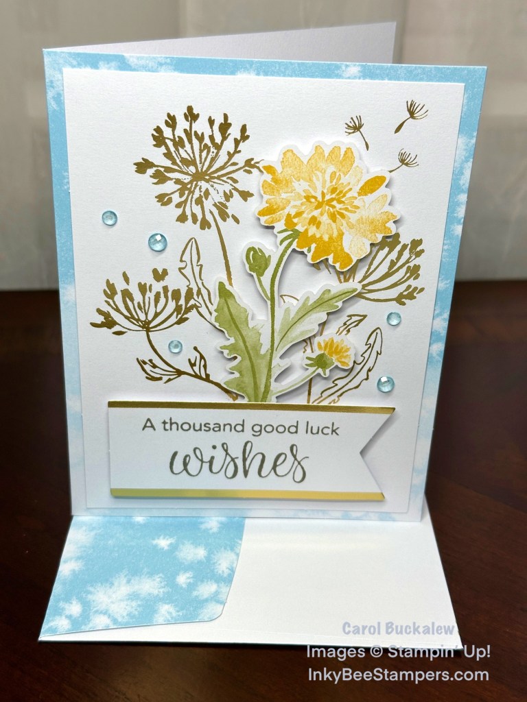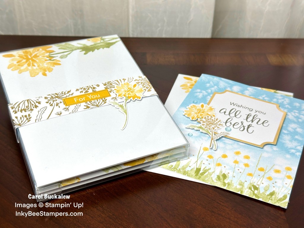 As if that weren’t enough, the All the Best kit also contained a sturdy see-through box which holds the completed cards. Just in case you would like to gift the cards to a friend (shown on the right)! The box included a pretty belly band and flower embellishment!