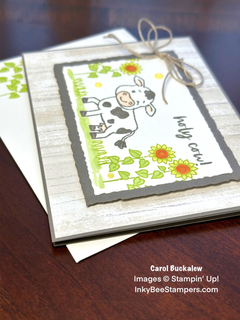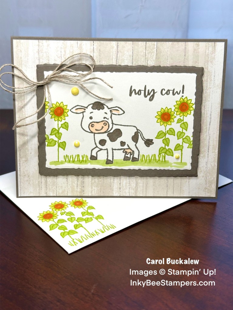 I selected a wood grain paper from the One Horse Open Sleigh 6″ x 6″ Designer Series Paper pack. This paper isn’t just for winter or the holidays – the reverse sides are perfect for any-occasion cards! The designer series paper was then adhered to a Pebbled Path card front. Using the Deckled Rectangles Dies, I cut out a mat from Pebbled Path cardstock and a rectangle from Basic White cardstock. On the white panel, I stamped a cow, grass and sunflowers and a sentiment was added towards the upper right of the rectangle. I used a variety of Stampin’ Blends to color in the images.