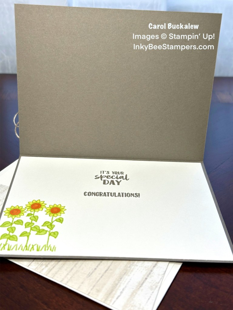 On the inside panel, two additional sentiments were stamped in Pebbled Path ink – “It’s your special day”, and “Congratulations”. The sunflower image was stamped onto the lower corner of the panel and colored with Stampin’ Blends The panel was then adhered to the inside of the card.