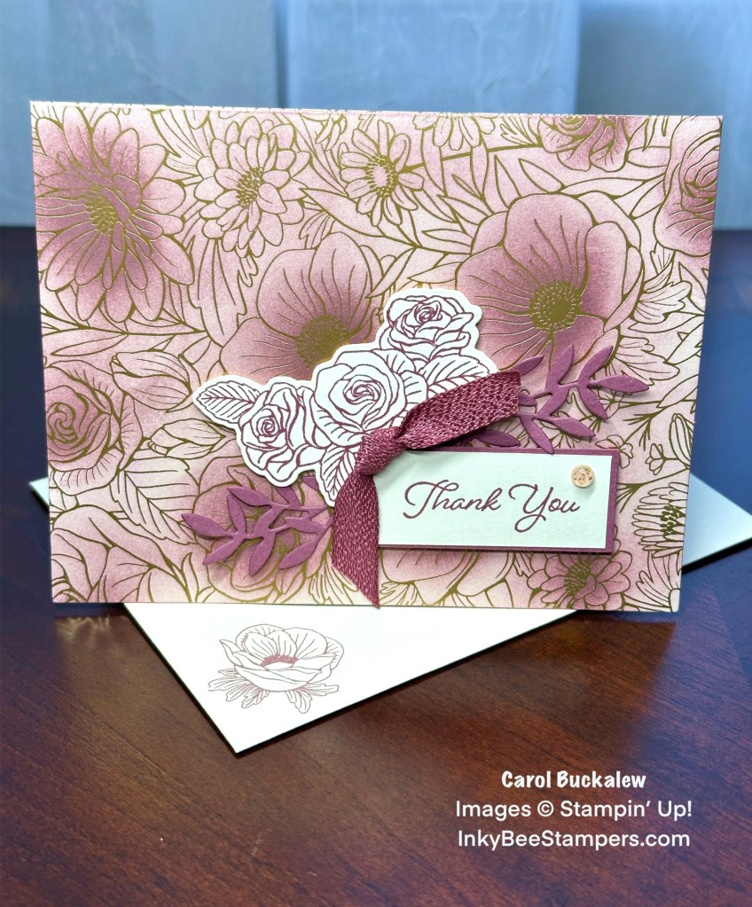 I used a Blending Brush to blend Moody Mauve ink over the front of the Gold Foiled Flowers Card base, and I concentrated the ink at the centers of the larger flowers. I then used a dry paper towel to buff any ink residue off of the gold foiled areas.
