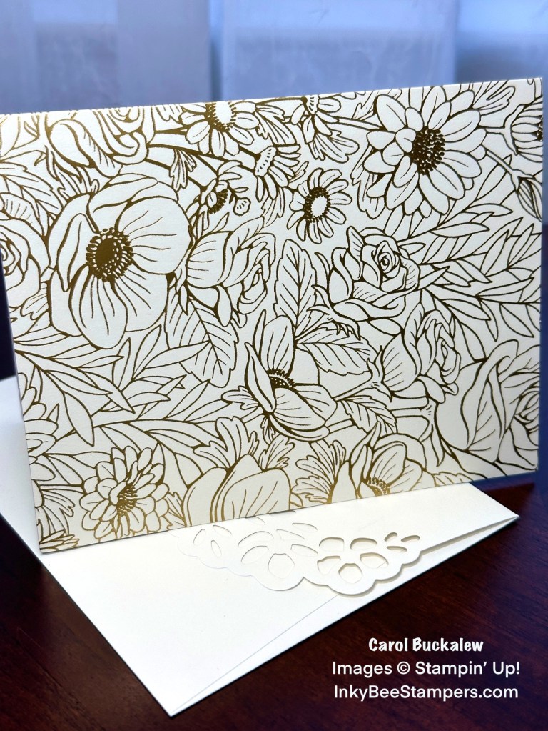I hope you enjoyed Christmas with your family and friends! My husband and I spent the day with our two grown sons, my mom and our two Westies, Maezie and Mackenzie – it was a wonderful day! I have another quick and easy, and oh so pretty, card for you today using products from the Forever Love Suite. I featured a card last week using products from this suite. Today’s card uses the Gold Foiled Flowers Cards & Envelopes which are included in the suite. There are a total of ten cards and ten envelopes in the pack. The cards contain gold foil flowers on both the front and the back and lovely, intricately cut Very Vanilla envelopes.