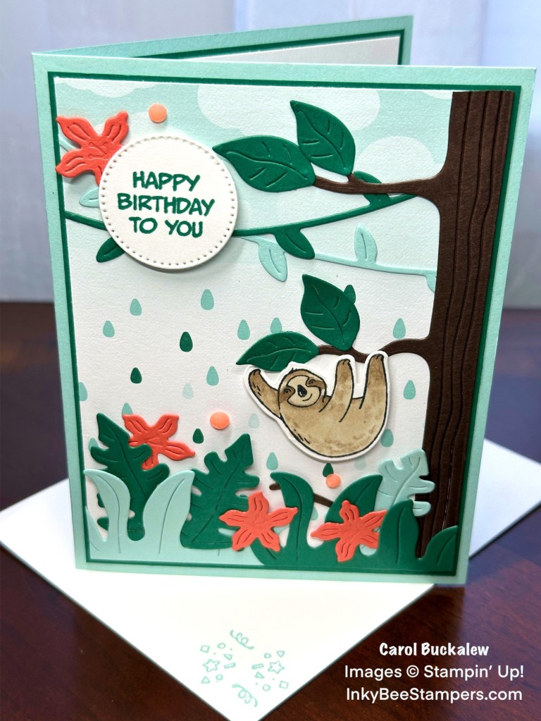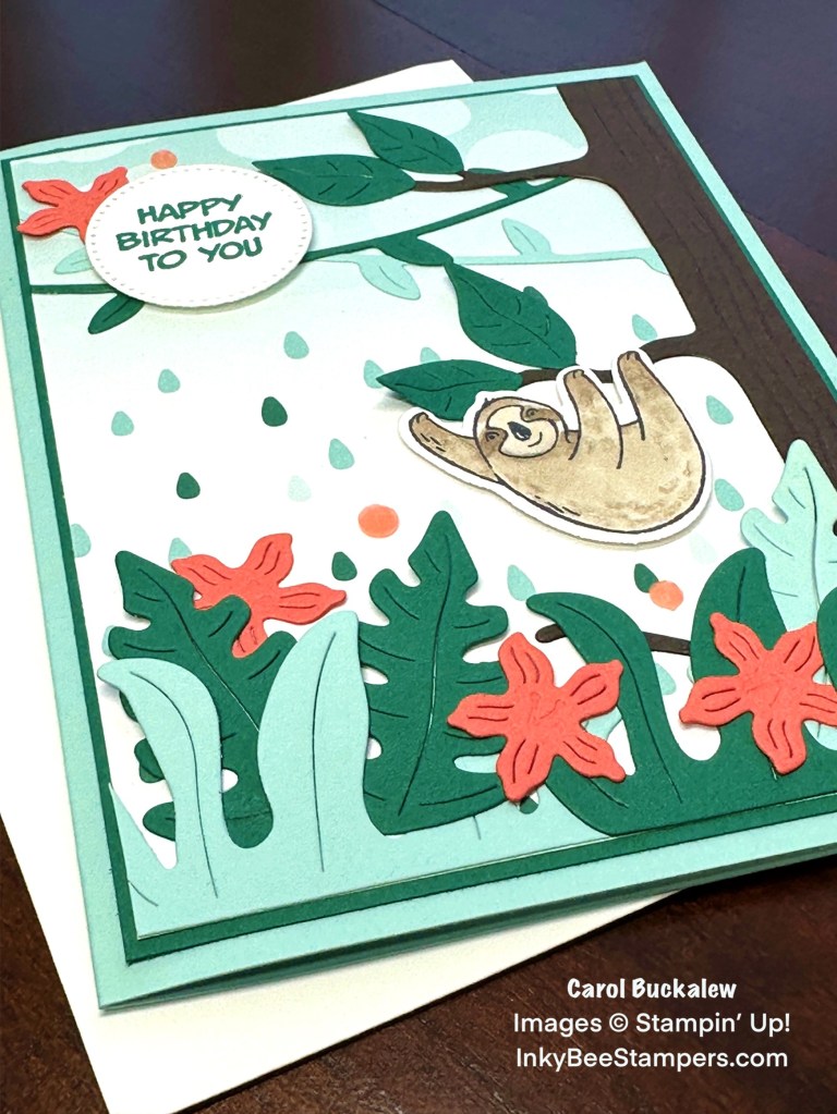 From the Jungle Pals Stamp Set, the adorable sloth was stamped onto a piece of Basic White cardstock in Tuxedo Black Memento Ink and die cut using the Jungle Pals Dies. I used Crumb Cake Stampin’ Blends to color in the image. The sloth was then adhered to the card front using Stampin’ Dimensionals. He’s hanging from the middle tree branch! Sloths always look like they are smiling…so cute!