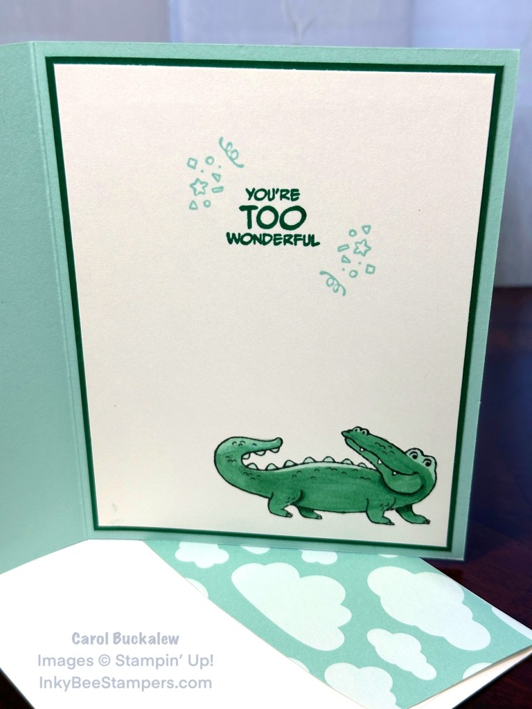 Another sentiment from the Zany Zoo Stamp Set was stamped on the inside of the card and I also used the confetti image and stamped this around the sentiment in Pool Party ink. Back to the Jungle Pals Stamp Set – I stamped the image of the alligator onto the lower corner of the panel and colored the image in with Pool Party and Shaded Spruce Stampin’ Blends. The panel was then adhered to another Shaded Spruce mat then adhered to the inside of the card.