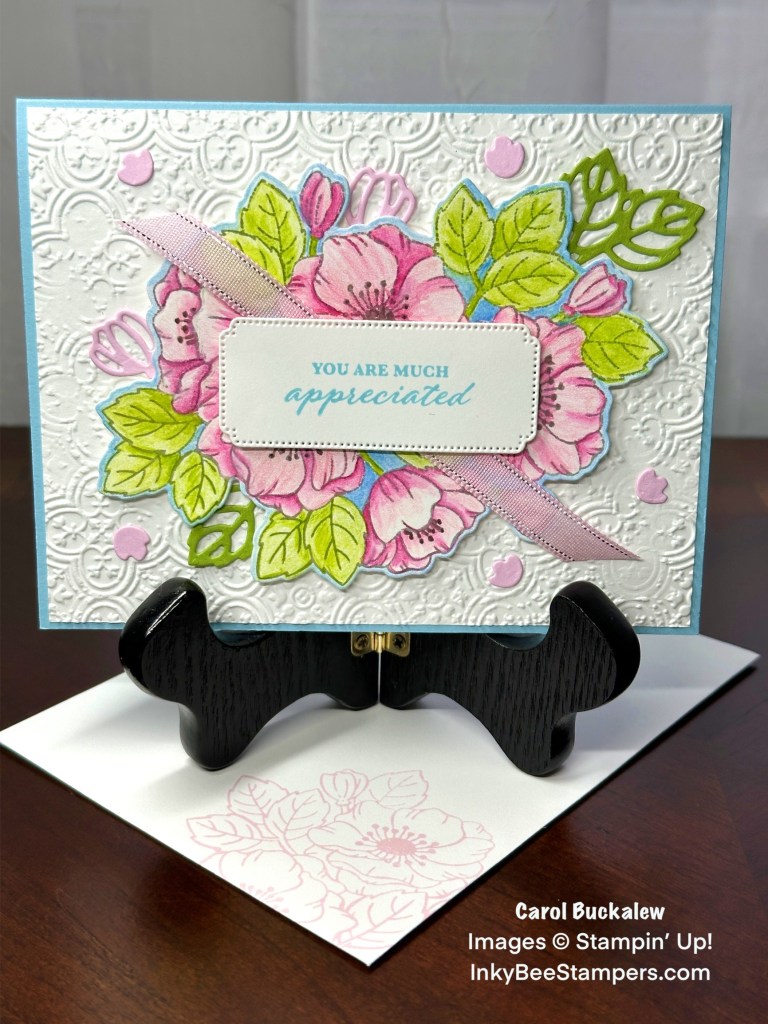 Several die cut rose buds and leaves were then adhered around the large floral image and the ends were tucked under the floral image. Several rose bud die cuts in Bubble Bath cardstock were adhered to the embossed panel around the large foral image.