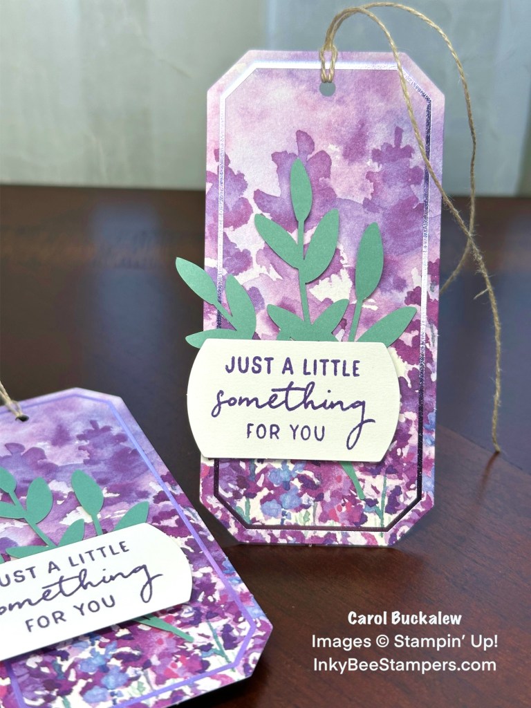The Lovely Lavender kit came with everything I needed to complete a total of eight cards – four of two different designs, and four gift tags! Instructions were included in the kit to make putting the cards and gift tags together easy. I chose to follow the directions on the included instruction sheet, but you can assemble your kit however you would like…including using some of the coordinating Perennial Lavender products to make your own creations! Also included in the kit were adhesives, Linen Thread, a Gorgeous Grape Ink Spot, stamps, card bases, coordinating envelopes and punch out flowers, leaves and sentiment labels!