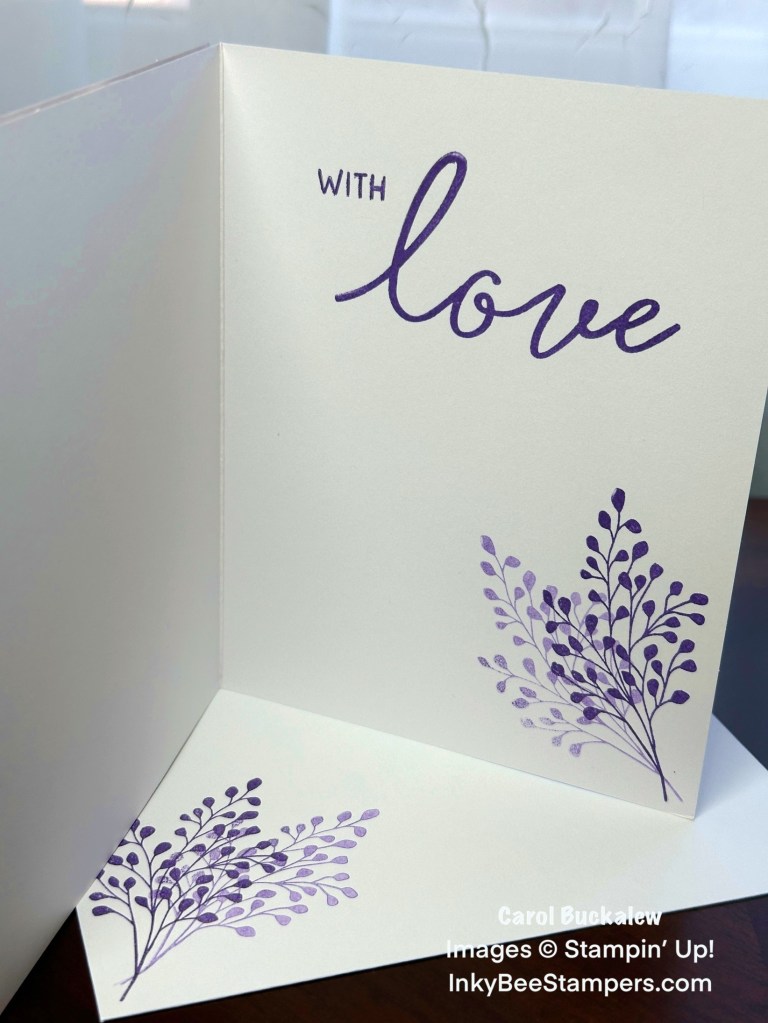 One of the card styles is this landscape card. This card involved a little stamping then adhering the pieces to the card front. It doesn’t get any easier than that! Check out the inside of the envelope which coordinates with the card.