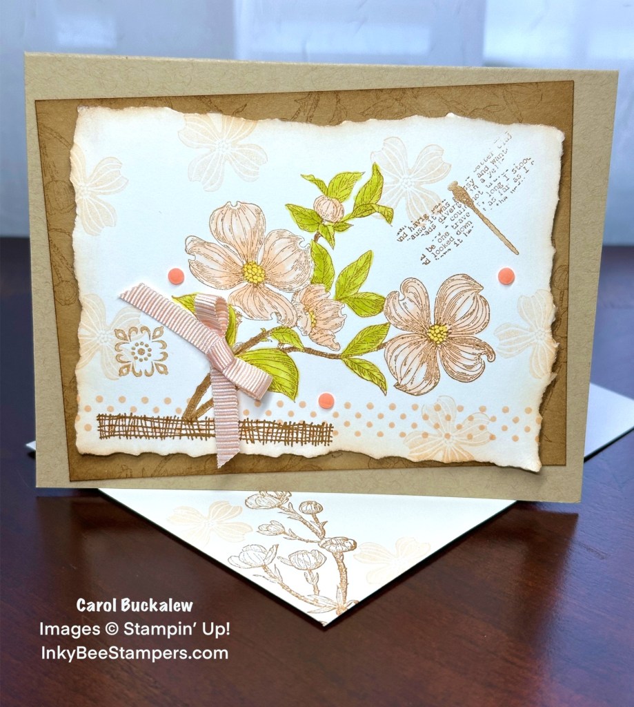 I started with a Basic White cardstock panel measuring 5″ x 3-3/4″ and I tore approximately a 1/4″ from the edges of the panel on all sides. I then second generation stamped the large dogwood image in Pecan Pie ink. I then used Stampin’ Blends to color in the image. Several other images from the stamp set were first and second-generation stamped onto the panel using either Petal Pink or Pecan Pie inks. I then used a Blending Brush to blend Pecan Pie ink around the edges to darken them.