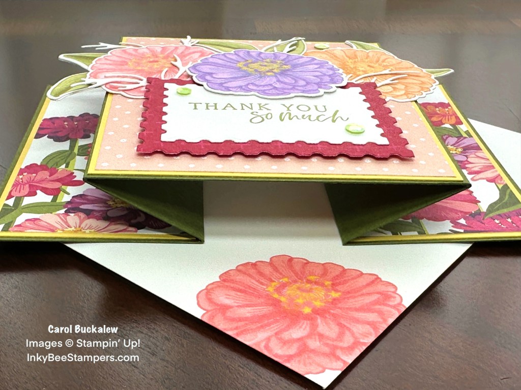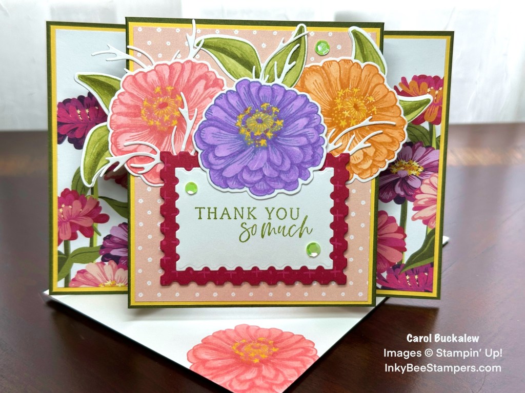 Today’s card features the beautiful Simply Zinnia Bundle and the Flowering Zinnias 12″ x 12″ Designer Series Paper on a fun Center Pop Out fun fold. This fun fold shows off this paper beautifully!