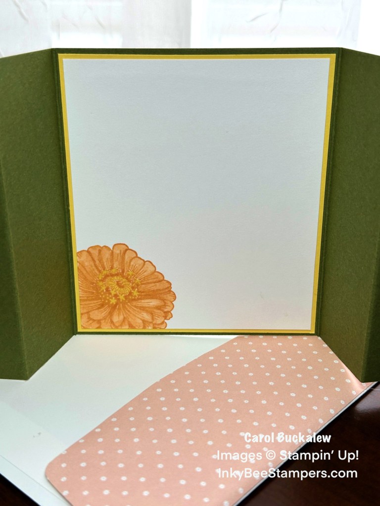 I started with a card base in Mossy Meadow measuring 11″ x 4-1/4″. The card base was scored at 2-1/4″, 3-5/8″, 7-3/8″ and 8-3/4″. The two outer scorelines are valley folds and the two center scorelines are mountain folds to create the center pop out. I cut a zinnia print from the Flowering Zinnias Designer Series Paper for the two outer panels on the card front and a dotted patterned paper sits on the center panel. All of the designer series paper panels were adhered to Daffodil Delight mats, then adhered to the card front.