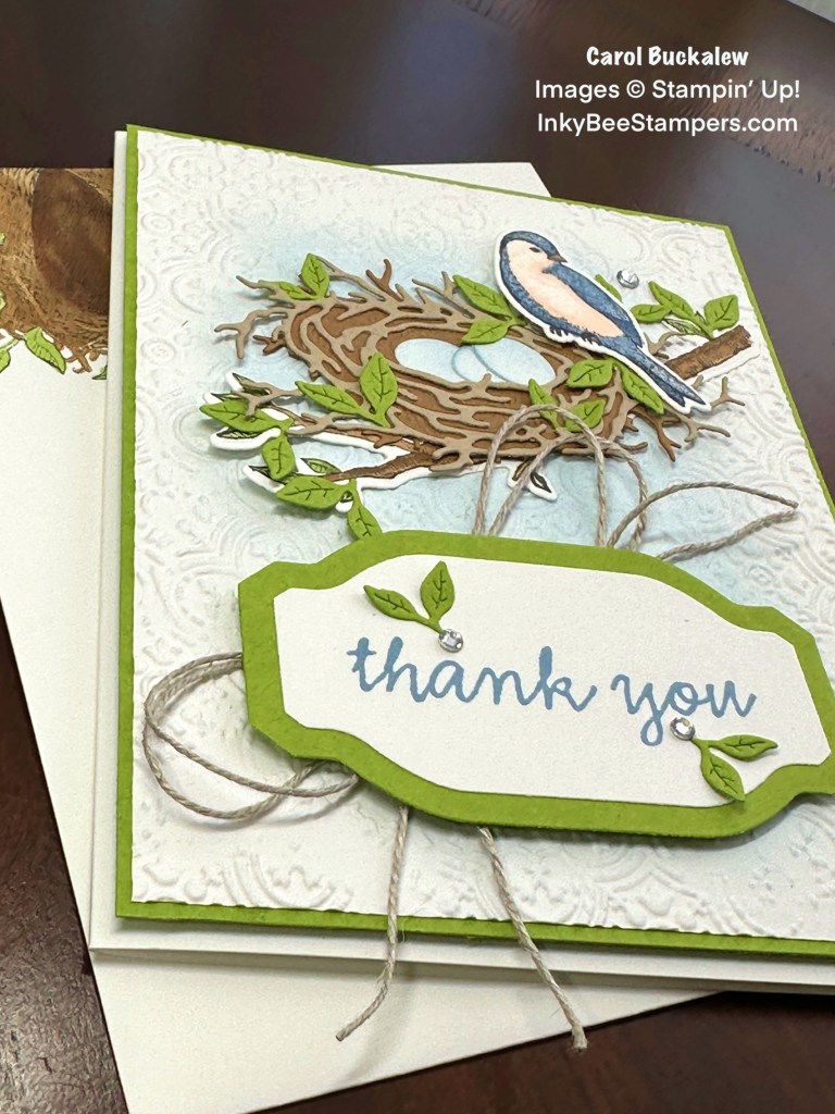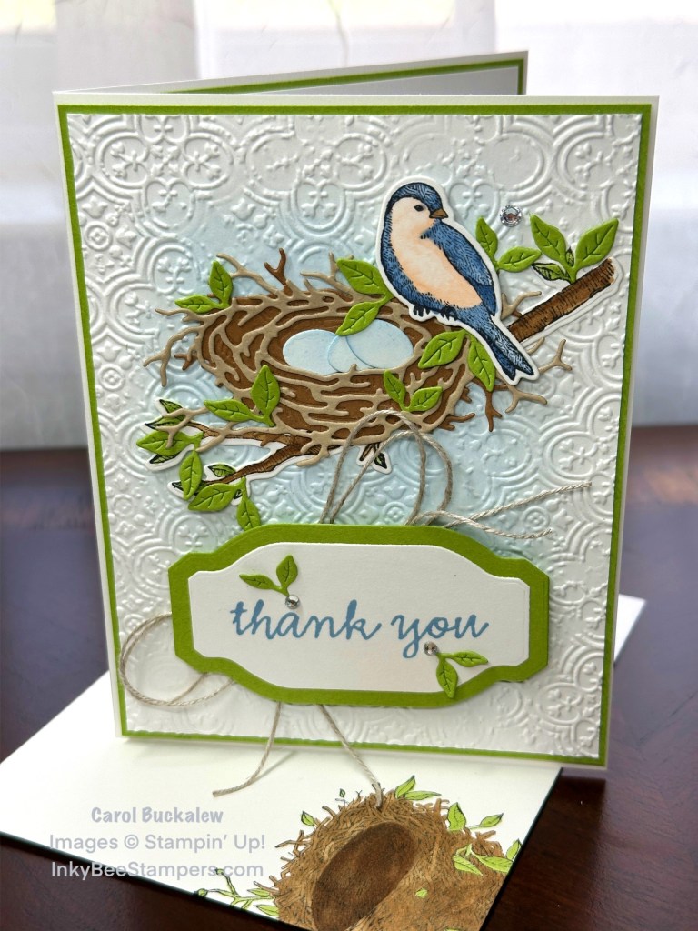 Today’s card was created using the Nested Friends Stamp Set, Nested Friends Dies and the Distressed Tile 3D Embossing Folder. This sweet bird is perched on a tree branch above her nest watching over her eggs! You can find the Nested Friends Stamp Set and Nested Friends Dies in the Online Exclusives section of the online store.